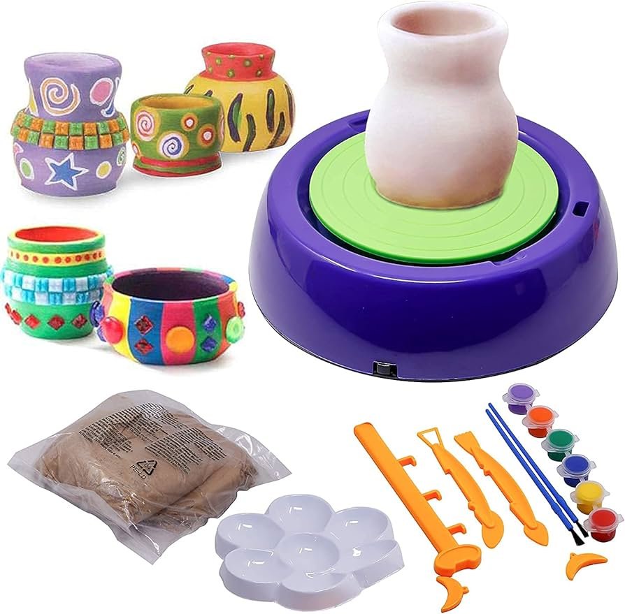 - Size: 22x22cm.Voltage: 3V.Battery need: 2x D Batteries(not included).Package Included:1 x Pottery wheel. 1 x Tray.1 x Engraved support column.2 x Sculpting Tool.1 x Cutting cord with grips.1 x Palette.1 x 6-color pigments.1 x Color Brush.2 x Clay.